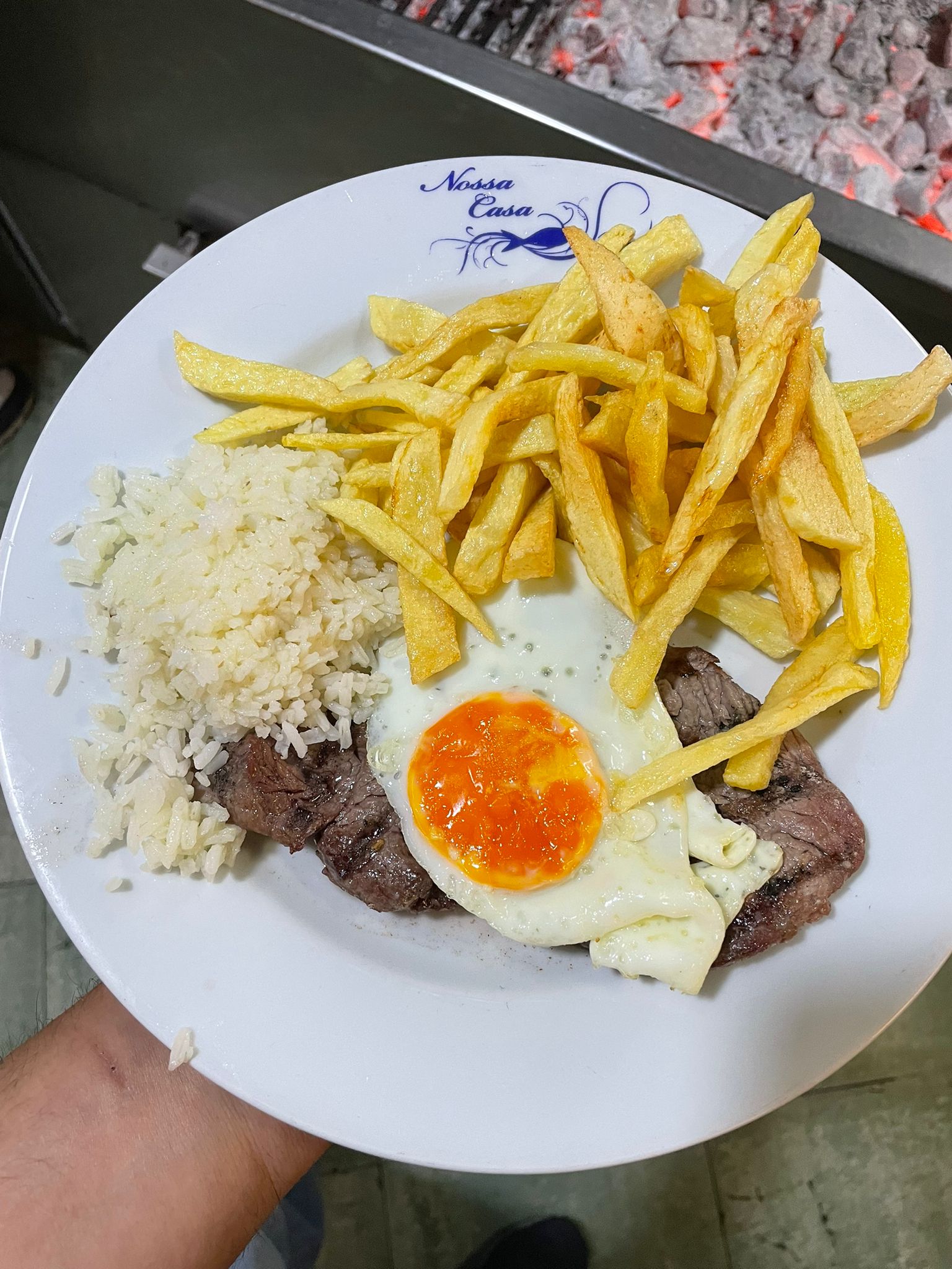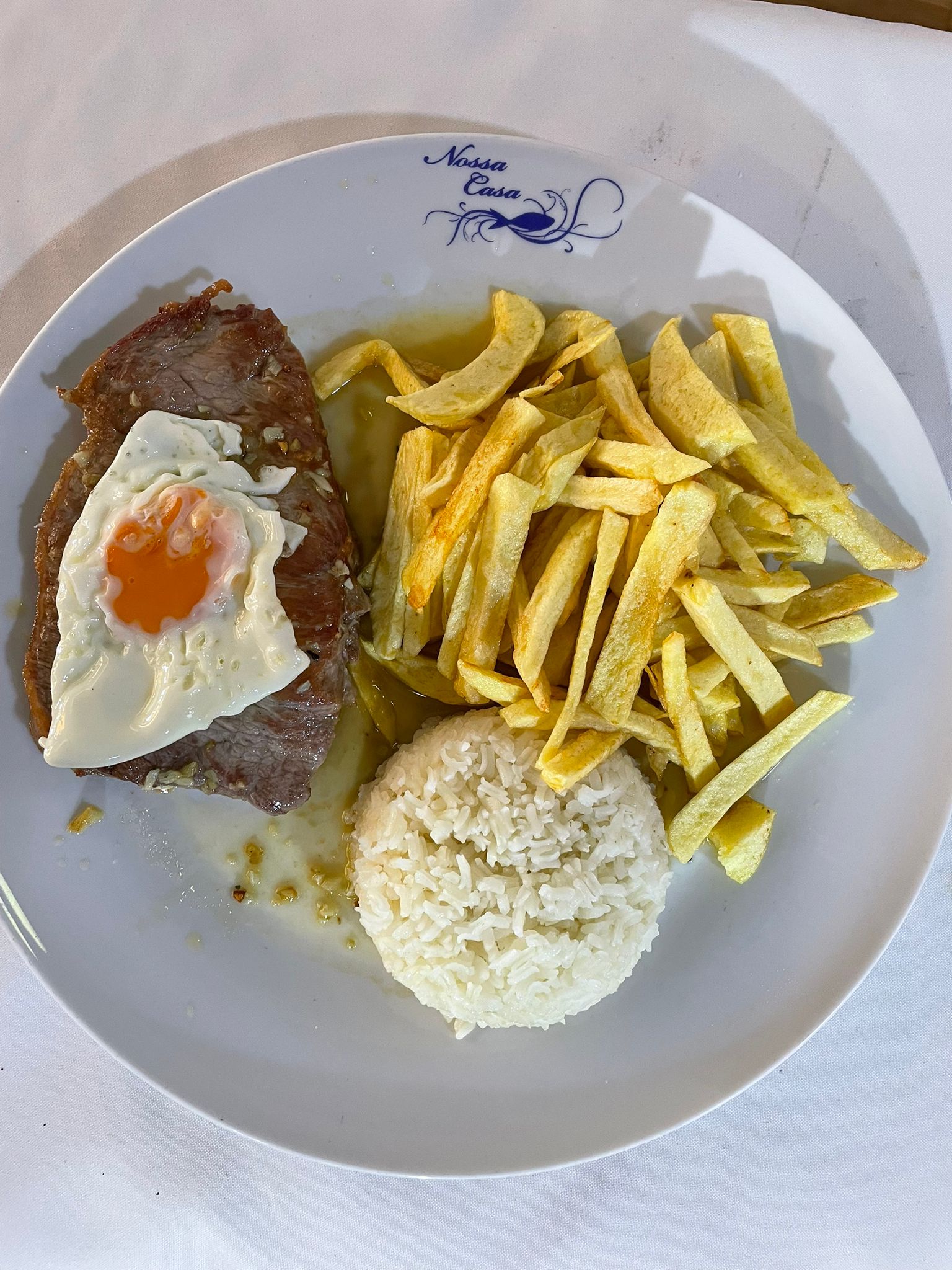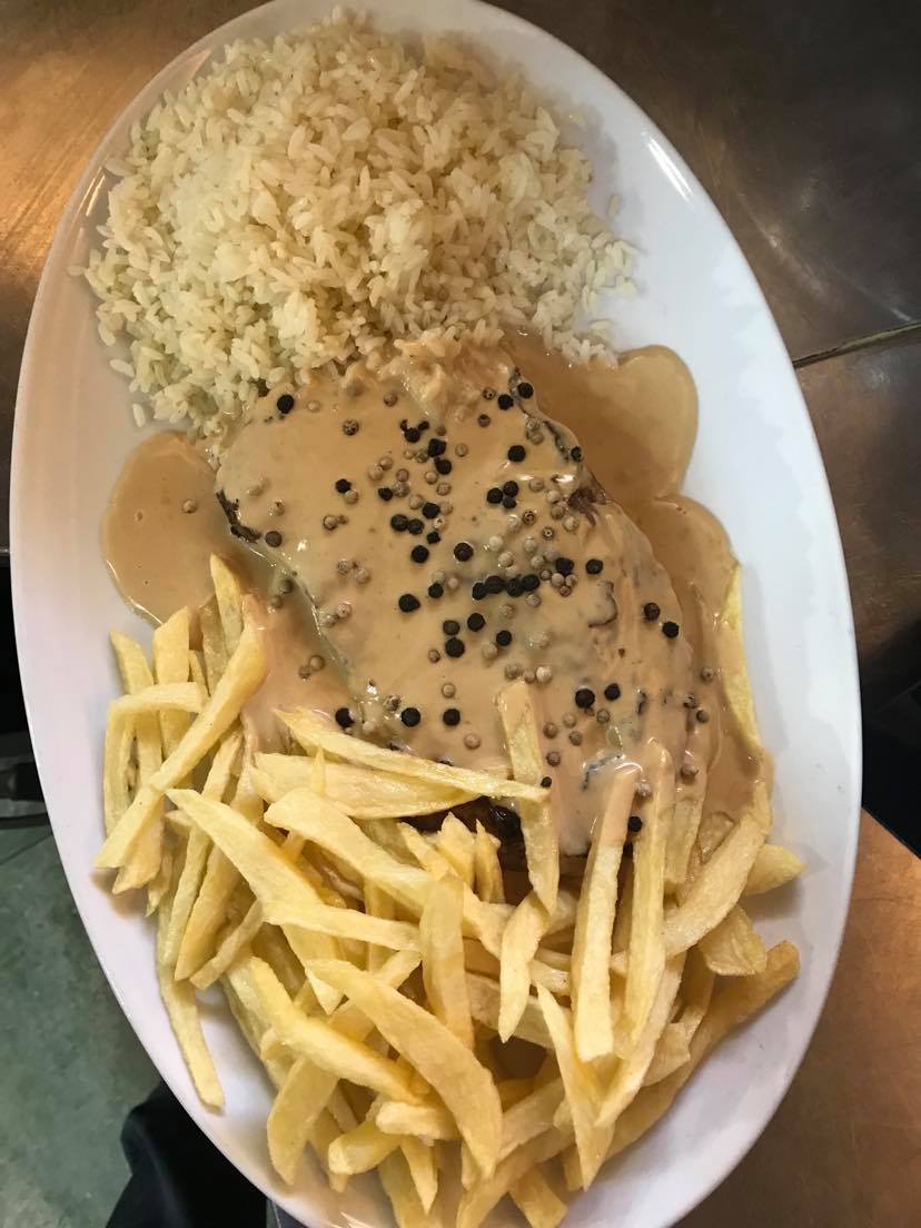 Steak and Egg with chips, rice
