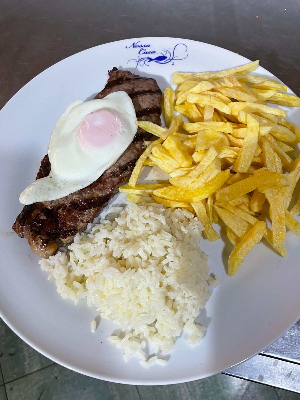 Steak and Egg with chips, rice
